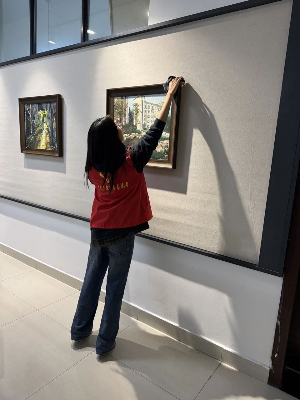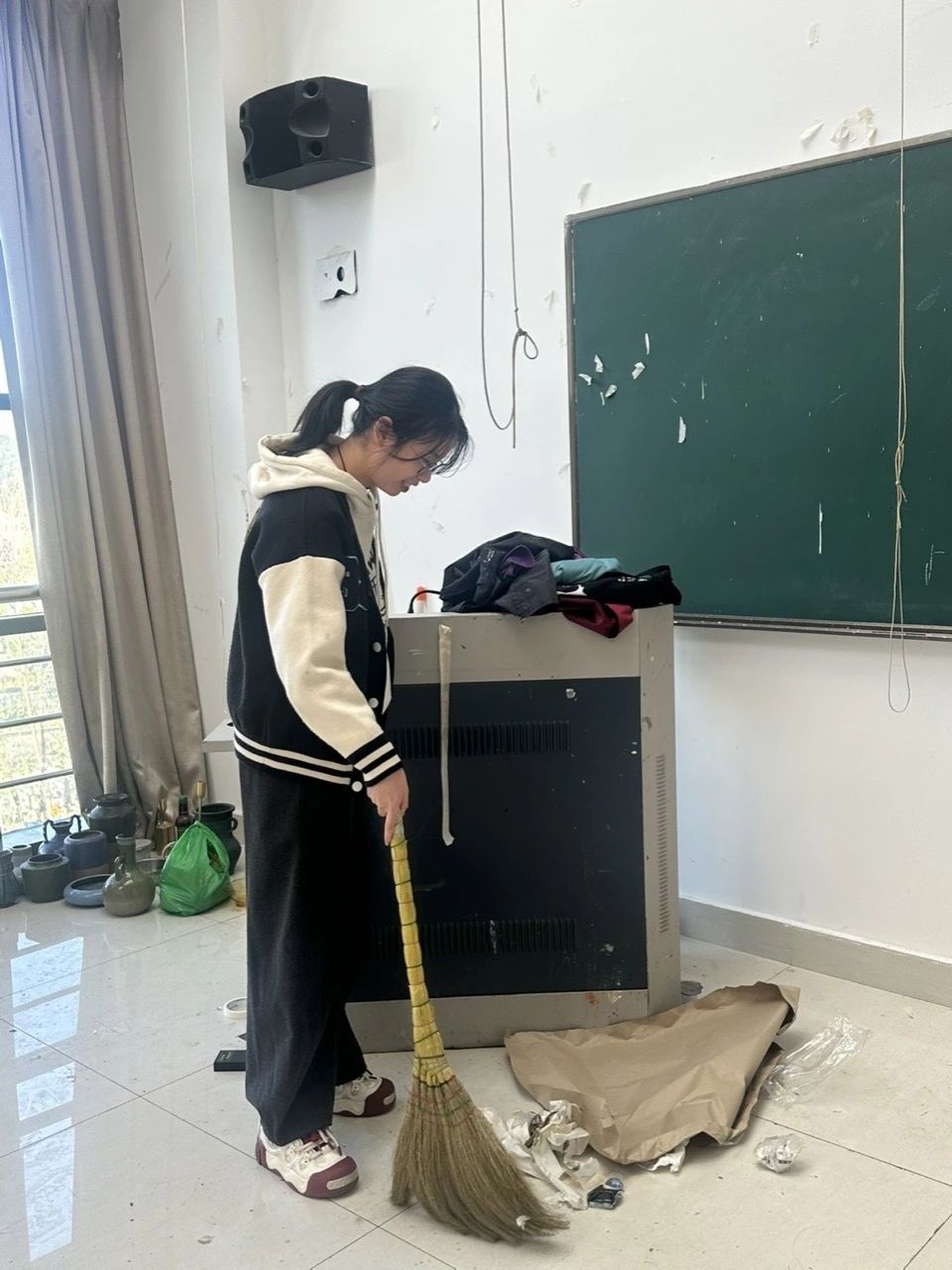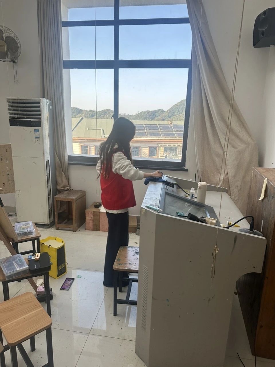 美术系的劳动现场同样井然有序。在袁文玥、吴玥等组长的带领下,十余名志愿者发扬不怕脏、不怕累的精神,对国画教室、油画教室等16间专业教室进行了深度清洁。他们小心挪动画架画板,清理颜料残渍,擦拭静物和各类雕塑,为美术创作营造了更加清新、整洁的空间。