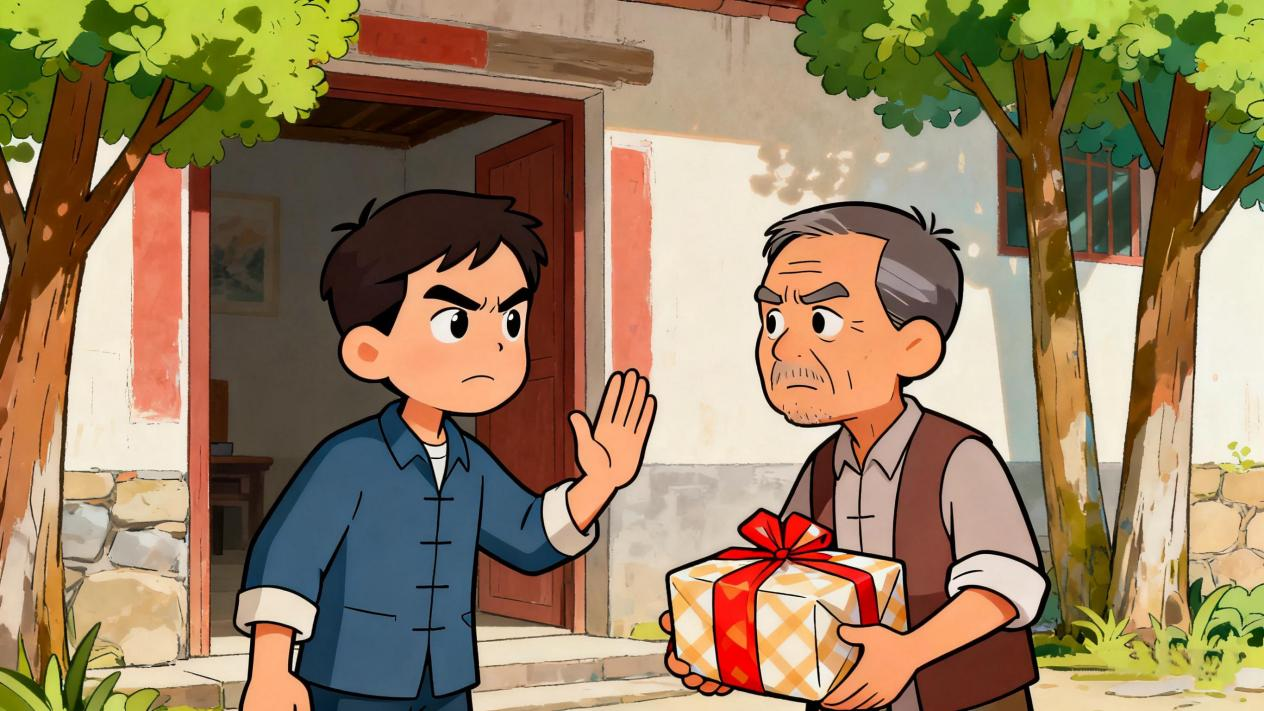 创作说明:本作品以卡通绘画的形式,描绘了黄大发拒绝供应商礼物的场景。画面中,黄大发神情坚定地摆手回绝,供应商手持礼盒面露错愕,鲜明的神情对比凸显黄大发坚守廉洁底线、不徇私枉法的品格。背景选用质朴的乡村院落,贴合其扎根基层的人物背景、整体画风简介明快,通过直观的视觉语言,将人物的廉洁操守具象化,传递出坚守原则、清真廉洁的精神内核。