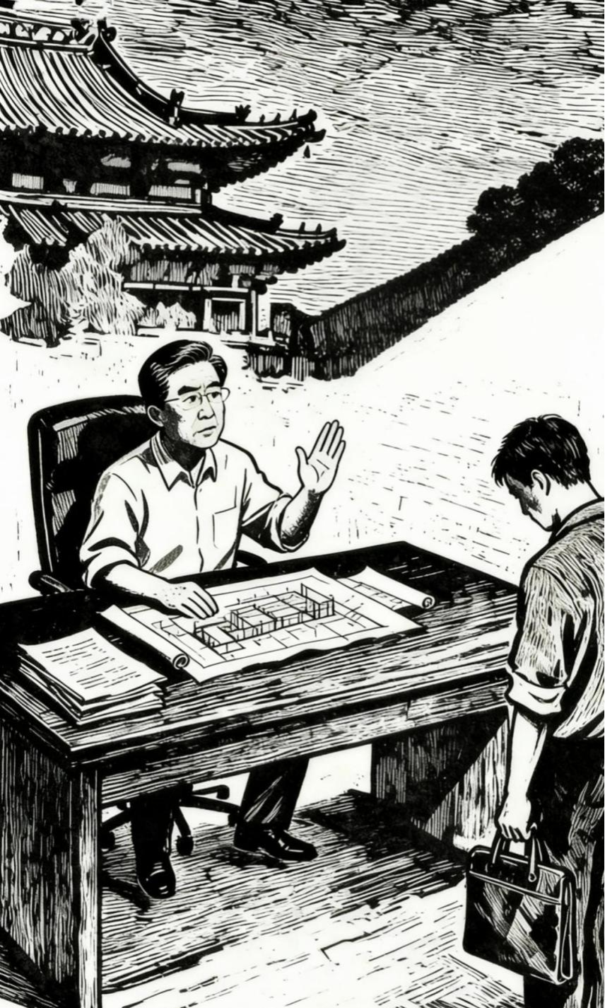 创作说明:以版画黑白色调显刚正,借古寺背景衬文脉初心,用“拒贿”细节刻绘干部守底线、护文脉的赤忱。