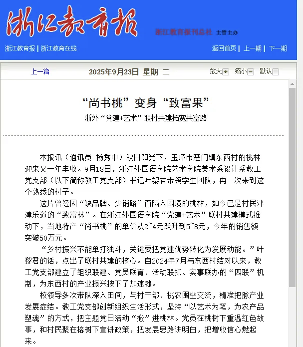 报道指出,2024年7月结对后,支部构建起“组织联建、党员联育、活动联抓、实事联办”的“四联”机制,为东西村发展按下“加速键”。支部还将助农融入课堂,《包装设计》课引入“尚书桃”设计项目。党支部书记牵头成立品牌设计小组,党员教师发挥专业优势,开启了“艺术赋能农产品”实践。设计中,团队反复打磨:重构玉环传统纹样,让包装有地方特色;融入书法笔触,让“尚书桃”三字更有文化味;用环保材质,既符绿色理念,又提产品质感。