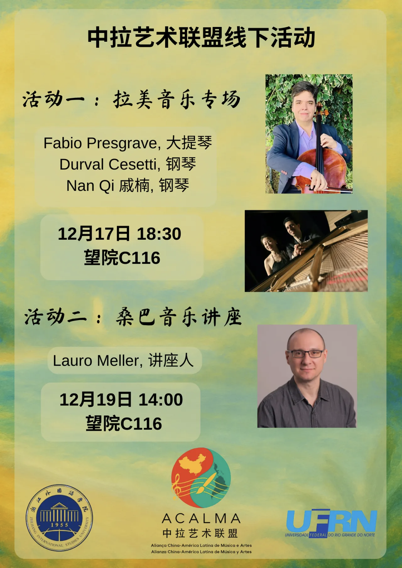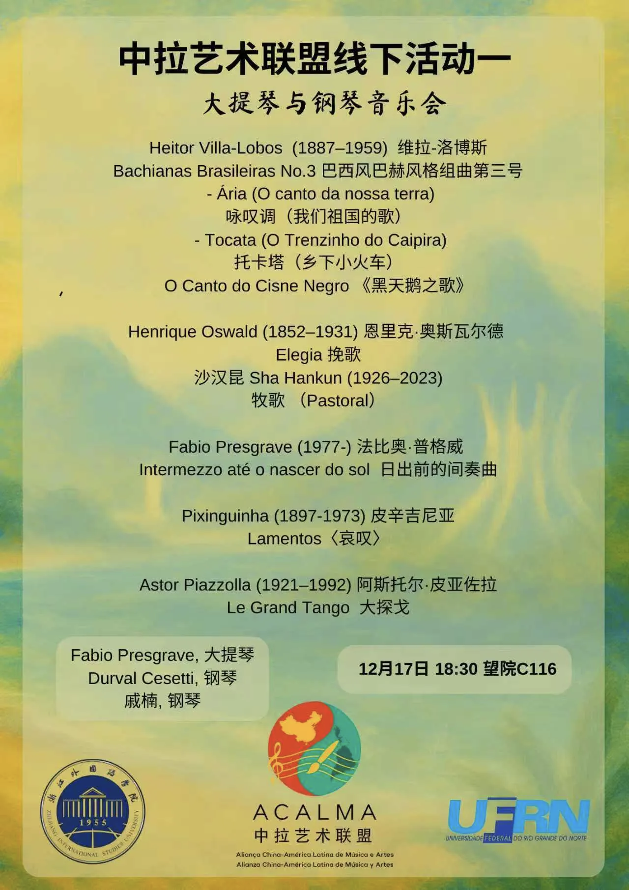 大提琴家法比奥·普格威(Fabio Presgrave)简历法比奥·普格威教授任巴西北里奥格朗德联邦大学(UFRN)音乐学院副院长。他曾在美国茱莉亚音乐学院获得学士和硕士学位,并在巴西坎皮纳斯州立大学(UNICAMP)取得博士学位。他曾以独奏家的身份与多支乐团合作演出,其中包括卡塔尔爱乐乐团、阿根廷罗萨里奥爱乐乐团、巴西交响乐团,以及阿雷格里港、坎皮纳斯、巴拉那、巴伊亚、米纳斯吉拉斯、塞尔希培、戈亚斯、埃斯皮里托桑托等州的交响乐团。他近年的独奏音乐会包括在多特蒙德的Orchestrazentrum、Kamper Konzert 系列、以及在西班牙奥维耶多和希洪的独奏大提琴音乐会,并在丹麦奥胡斯的Musikhuset和德国美因茨的 Villa Musica演出。作为教育家,他曾在多家著名院校开设大师班,包括赫尔辛基的西贝柳斯学院、埃森大学、Interlochen 学院、爱沙尼亚塔林大学、西班牙奥维耶多音乐学院以及丹麦皇家音乐学院。他也担任里约热内卢联邦大学(UFRJ)研究生项目的合作教授,并担任“阿尔多·帕里索特计划”的协调人,该项目致力于为卡伊科和朱库鲁图的女孩们提供弦乐器教育。