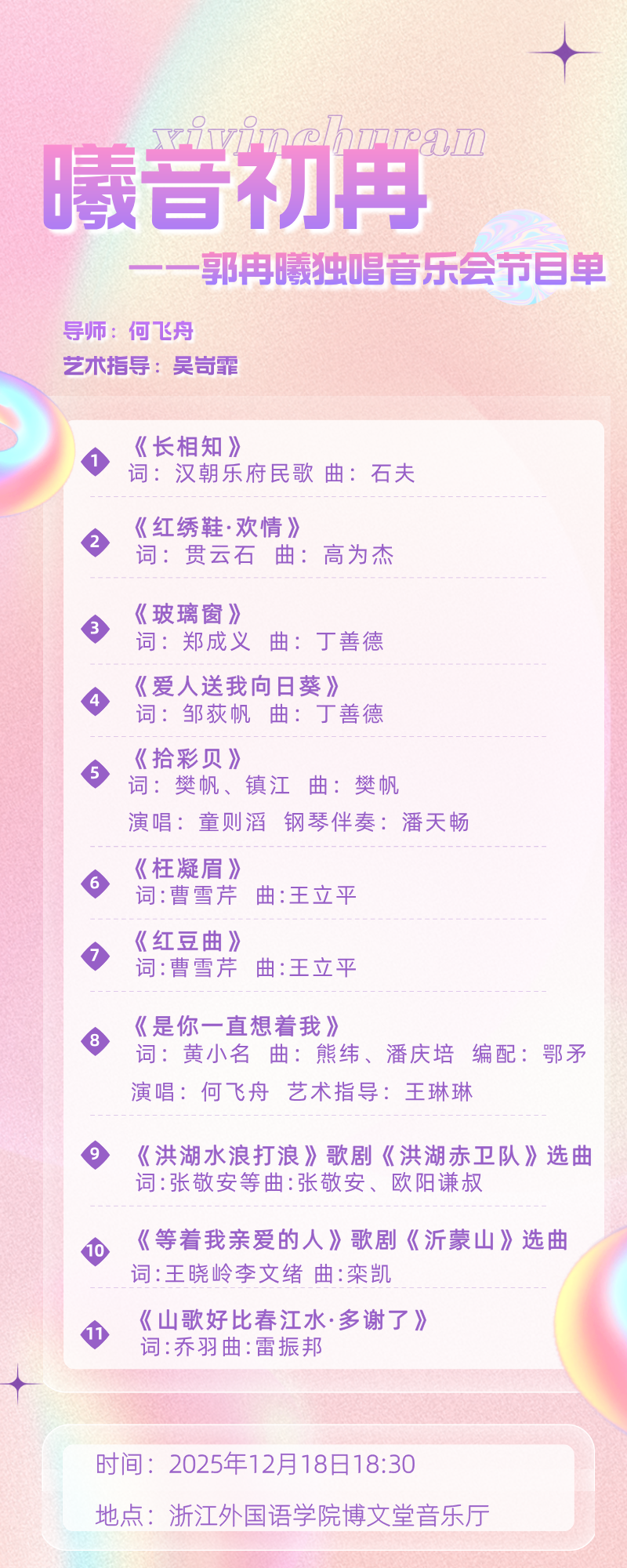 2024级音乐学专业学生,2020年开始学习声乐,先后师从浙江音乐学院易丹丹老师,浙江外国语学院何飞舟老师。在校担任班长职务,曾获校第十七届声乐技能大赛三等奖 第十届香港声乐公开赛三等奖 第十一届香港声乐公开赛二等奖 2025年日本东京国际艺术节声乐大赛高等师范院校专业组民族唱法独。